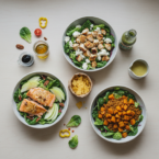 To make a satisfying lunch salad, be sure to top this salad mix with a.) carbohydrates, b.) protein c.) dressing that has some fat in it and d.) a flavor booster or two. There’s no need to spend tons of time prepping separate ingredients – just use what you’ve got on hand! For carbs, you could use crushed tortilla chips, fruit, or leftover roasted sweet potatoes like I did, or dig into your cabinet and heat up some microwavable brown rice or quinoa. To add protein to my salads, I just used leftovers from my main dishes that week – roasted salmon, grilled chicken, and Indian-spiced lentils. If you don’t have any leftovers on hand, top with nuts and cheese, or quickly cook up some hard boiled eggs. To ensure plenty of options for dressing, I like to have a combination of bottled dressings, plus the ingredients to quickly throw together a vinaigrette. I rarely follow a recipe – just eyeball about half vinegar or citrus juice and half extra-virgin olive oil, and if desired, add some fresh garlic, herbs, a dash of mustard, or spices. Flavor boosters can be anything you have in the fridge – olives, sun-dried tomatoes, cheese, toasted nuts, herbs – basically anything that’ll get you excited about your salad!