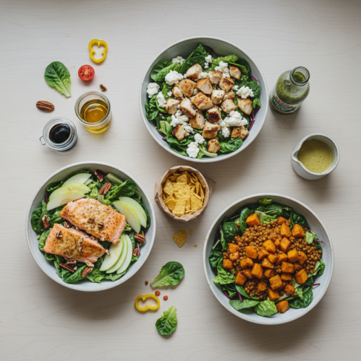 Three quick and delicious salad variations using simple ingredients. Perfect for a light lunch or a quick weeknight meal.