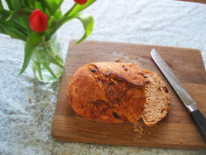 I had to try a recipe that compared making bread to having a pet cat. It requires minimum effort, a little bit of waiting, and given that I have used it six times with five perfect results, and one almost perfect result, I would have to say it is foolproof. I’ve adapted a plain loaf to make a tomato and fennel loaf, which is fantastic with some very seasonal wild garlic pesto and a schmear of goats cheese. This makes a decent 500g loaf, and just requires you to plan a day ahead.