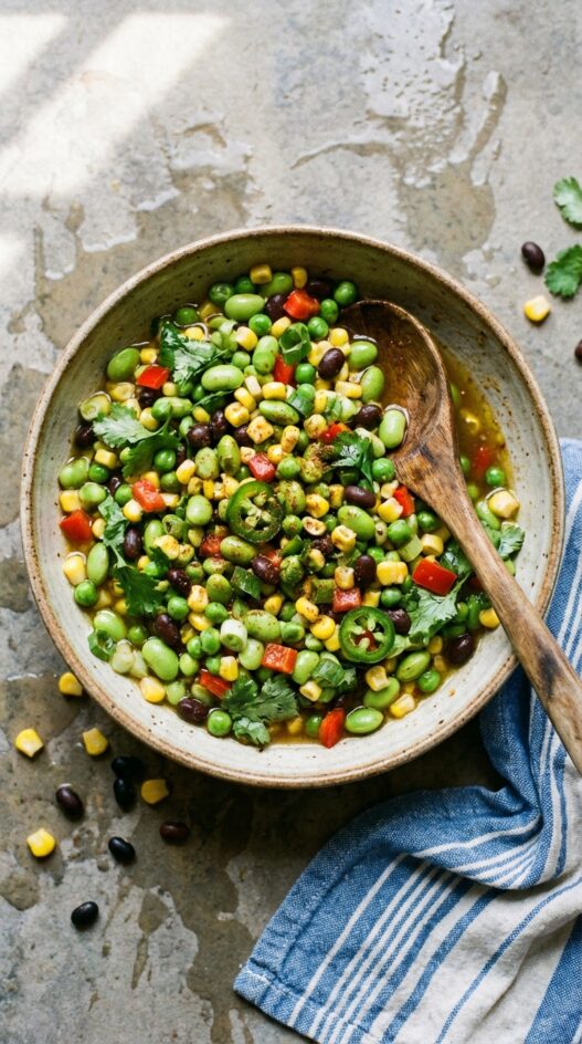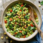 - Frozen edamame and corn can be substituted; thaw completely before using.