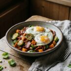 A hearty hash with crispy bacon and a perfectly runny egg. Perfect for a satisfying breakfast or a quick weeknight dinner.