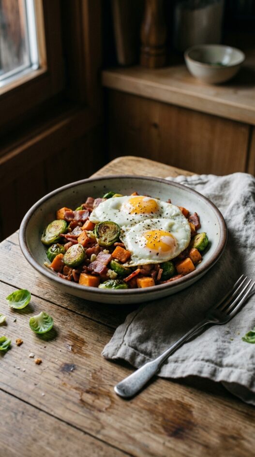 An EGG For Every Occasion — Sweet Potato, Brussels Sprouts, and Bacon Hash