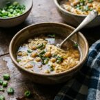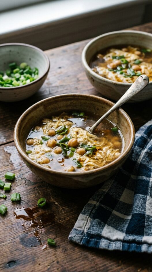 A friend showed me this soup during a stretch of gray January weeks when neither of us wanted to cook but both of us wanted something warm. She called it egg flower soup, which I’d heard before but never made, and the name stuck in my head long after I’d gone home. It’s simpler than any recipe I’d expected: stock, chickpeas, soy sauce, and eggs poured in a slow, steady stream while you stir. The eggs set into silky ribbons instantly. Green onions on top. I’ve made it probably thirty times since then, often for lunch, often alone, always glad I did.