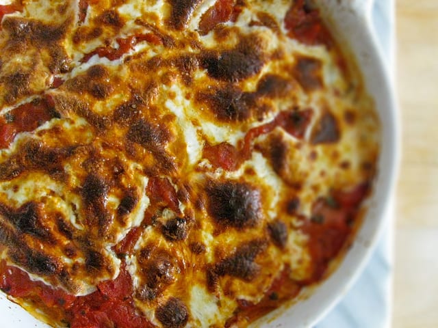 - Ladle a bit of tomato sauce into the bottom of a baking dish – to prevent the eggplant from sticking to the bottom.
