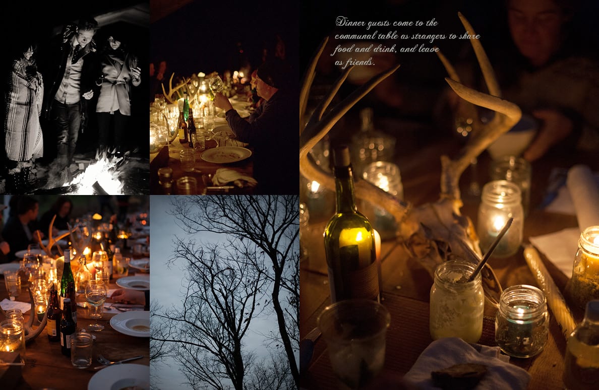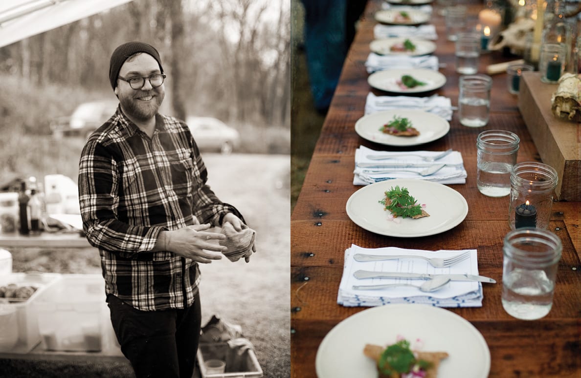 When planning his first farm-to-table event in conjunction with Carriage House Farm, Chef Ryan Santos of the popular Arts and Lettuce dinner club left no detail overlooked. New table wear had been purchased; in fact, even the massive communal table itself was constructed just for the evening by Carriage House Farm owner Richard Stewart, and the menu was meticulously planned after consulting with Stewart, Carriage House forager Abby Artemisia, Napoleon Ridge Farm owner Tricia Houston, and a local hunter. Everything was to be prepared outside in cast iron cook ware over an open fire, something Chef Santos had been anticipating for quite some time; he had been sourcing the coveted well-aged pans from friends for weeks in advance. “As a chef I’m always looking for a new challenge and a new skill to learn, and we [the Please staff] wanted the challenge of not having electricity,” he says.
