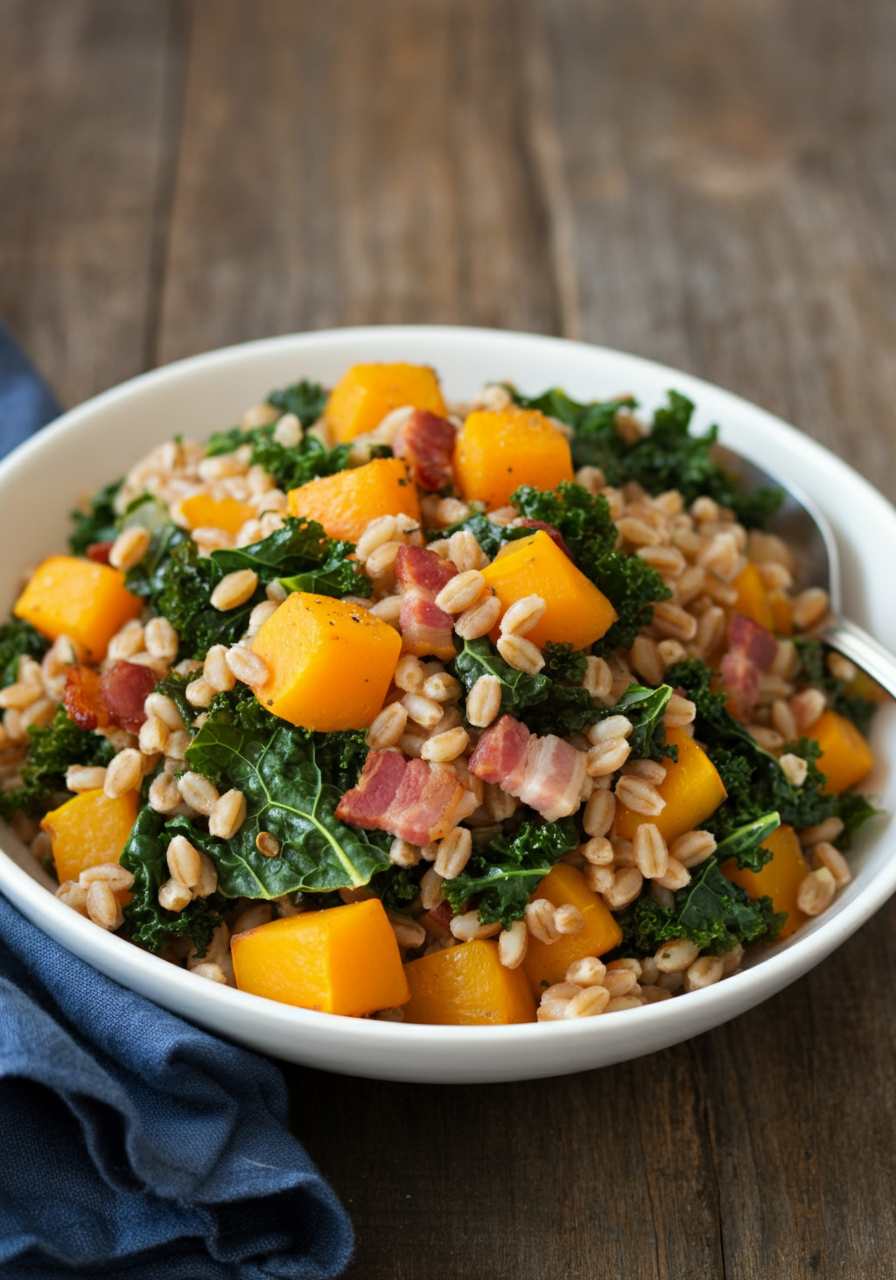 This Baked Farro with Butternut Squash, Kale and Pancetta is a healthy comfort food dish that’s full of flavor! It’s perfect for the cold, winter months ahead.
