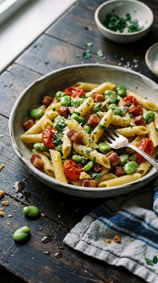 This Fava, Pancetta, and Tomato Penne is a delightful pasta dish that celebrates the fresh, nutty flavor of fava beans, complemented by crispy pancetta and sweet cherry tomatoes.
