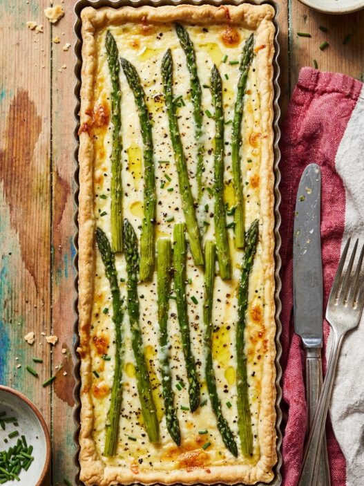 Campari Sangria Spritz and charred bread with prepped dips, spreads, hardboiled eggs, charcuterie or cheeses. If you’re still hungry for a proper dinner, serve grilled asparagus with honey mustard dressing and shaved parmesan and foil packet salmon with lemon, thyme and blueberry.