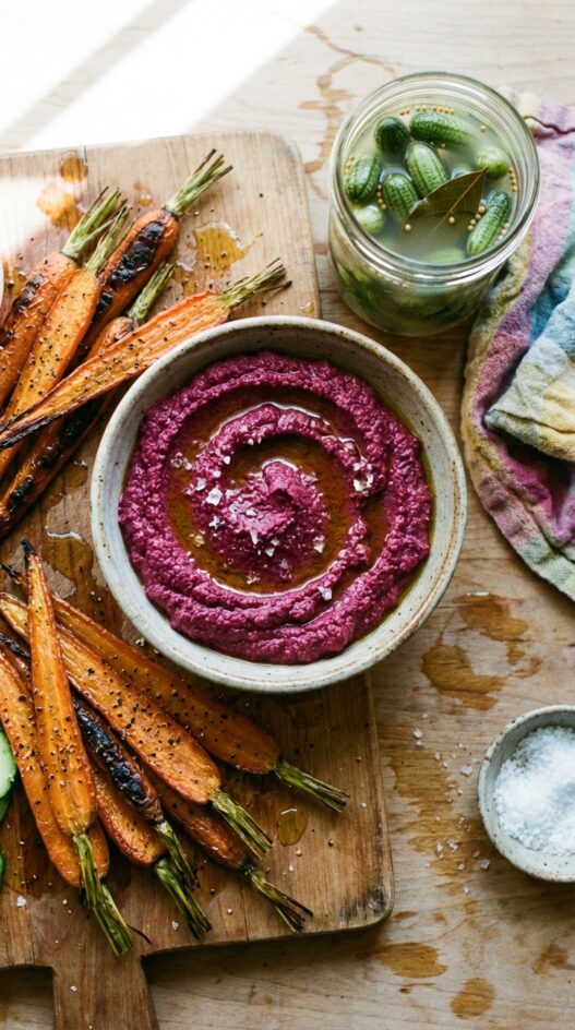 Featuring homemade beet dip, roasted carrots, and pickled cucumbers.