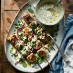 These feta-brined chicken kebabs are a perfect recipe to throw on the grill and then serve with an herbed feta sauce.