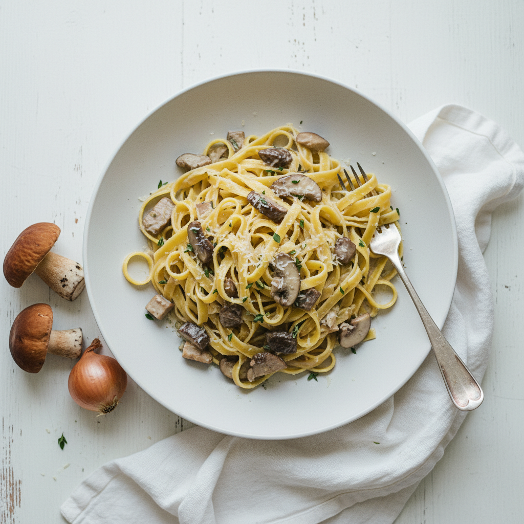Fresh pasta tossed with earthy porcini mushrooms in a creamy parmesan sauce. A taste of Tuscany in your kitchen!