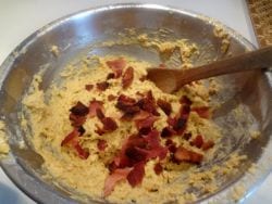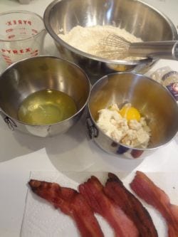I tossed ingredients around in my head for a while. I knew there was that log of goat cheese with fig in the refrigerator. It was from Cotsco so I would have to make something out of at least half of it; after all who could eat a friggin pound of goat cheese? And cornmeal. Certainly cornmeal would belong in a savory waffle. And bacon. Everything’s better with bacon, right? I headed into my lab to work on my experiment.