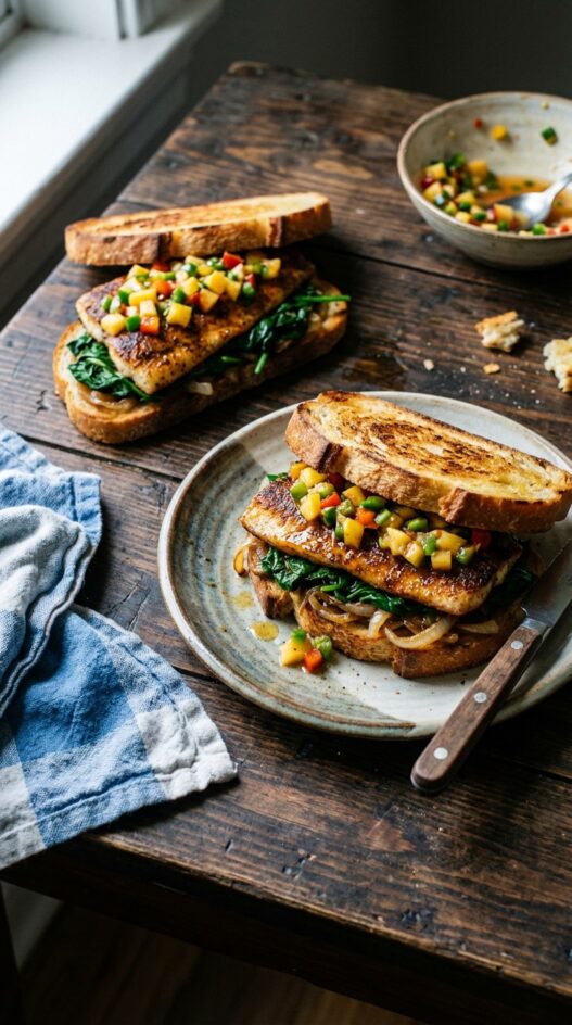 - To assemble: Place half the onions on one slice of bread. Top with a fish fillet. On another slice, layer half the spinach, then a generous scoop of salsa. Repeat with remaining bread and ingredients. Top salsa bread with fish bread, and serve.