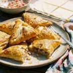 Flaky pastry triangles filled with savory five-spice pork and onions.