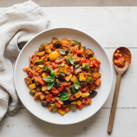 Ratatouille has a reputation for being fussy, but this version just asks you to chop things and let the pot do the rest. Simple enough. Eggplant, zucchini, bell pepper, onion, canned tomatoes, thyme, a bay leaf. The vegetables release their own liquid as they cook, and after about 25 minutes everything goes soft and savory and fragrant in a way that feels like it took much longer. Fresh basil at the very end, not before. Good warm or at room temperature, over pasta, polenta, crusty bread, or on its own.