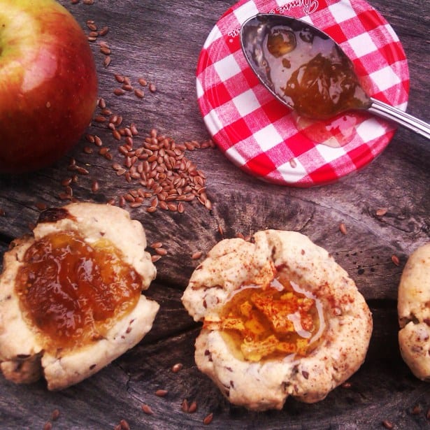 - On a Baking sheet with parchment paper begin to roll small to medium ball with dough. Once that is done make a little well, like a thumb print in the center of each cookie. Fill them with you desired filling in this case I used fig jam,apples, cinnamon and honey.