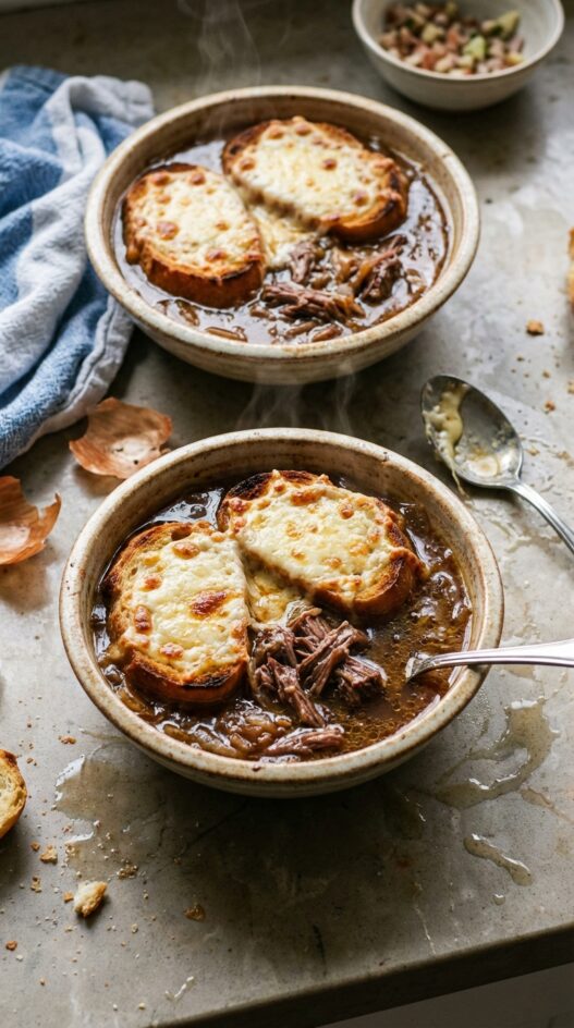 Can we talk about how this might be the ultimate cold-weather dish, people? Short ribs braised in red wine and beef broth until they fall apart, then shredded into a French onion soup base with caramelized onions, sherry, and red wine vinegar. The soup gets ladled into oven-safe bowls, topped with crusty baguette slices and Gruyère, then broiled until the cheese melts and bubbles into a golden crust. I mean, come on!