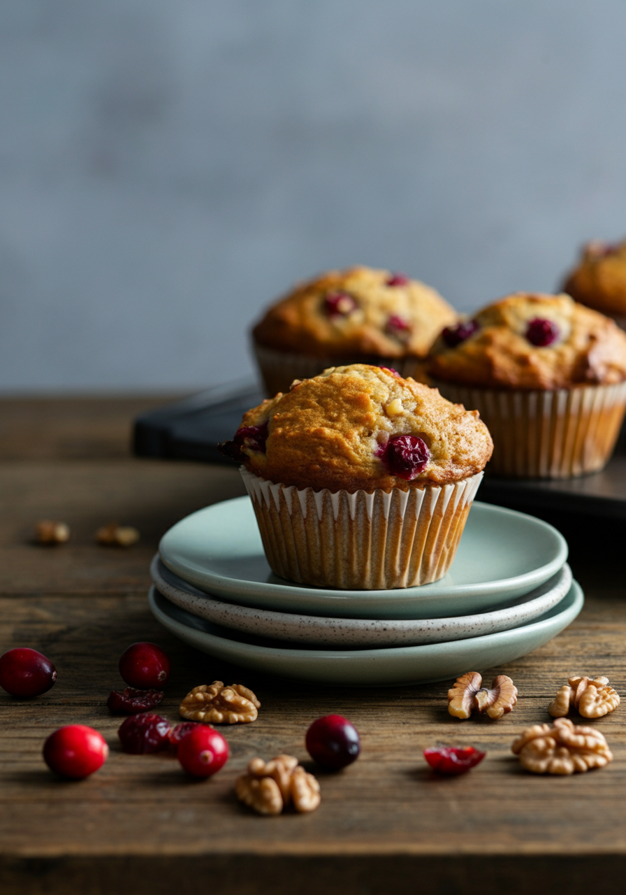 Sweet and tart cranberry orange muffins with crunchy walnuts. Perfect for breakfast or a festive treat.