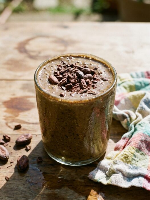 - Add as much water as you like – I prefer a more liquid consistency – and mix very well again for 30 to 60 seconds. Pour in glasses and decorate with edible flowers.