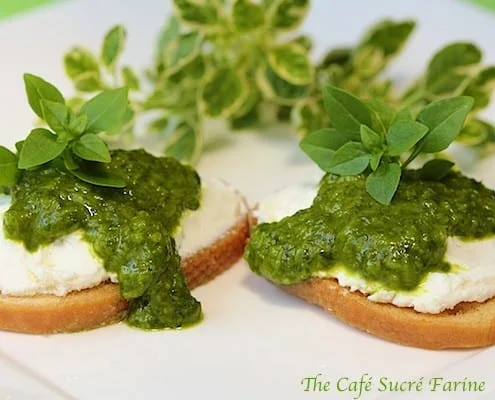 We loved the final results. It’s fantastic on grilled meats, adding a zesty freshness AND it makes a lovely and delicious appetizer. I spread crostini (you could use any type of cracker) with goat cheese (cream cheese would also be wonderful) and drizzled it with the vibrant chimichurri. You could also serve it as a dipping sauce for warm bread, steamed shrimp or with crudités (raw veggies).The gorgeous bright green color adds visual appeal to everything you serve it with. I think you’ll be getting requests for this one again and again!