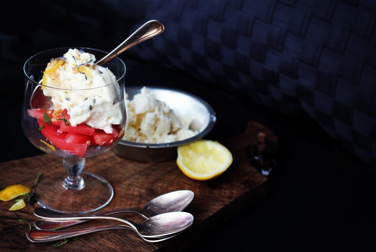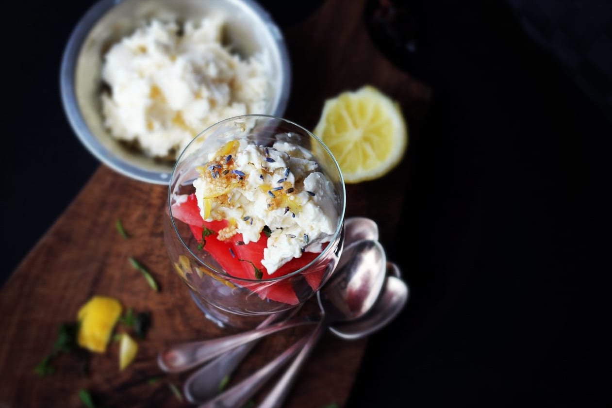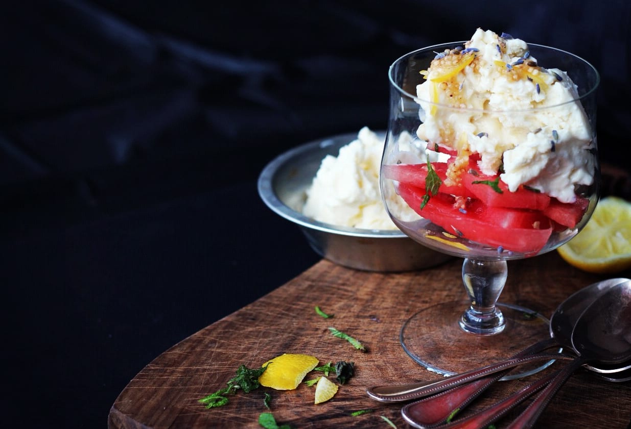 Cool, refreshing, and light, this ricotta ice cream recipe makes a tub full of goodness that tastes as good as it looks. The addition of honey, vanilla, and rice milk gives it a richness and depth of flavour that sings all the way from the tip of your tongue to the bottom of your belly. Scooped and served with freshly cut wedges of juicy watermelon, thinly sliced mint and lavender buds from the garden, and drizzled with a simple syrup bursting with citrusy sweetness. One scoop and you’ll be walking on sunshine.