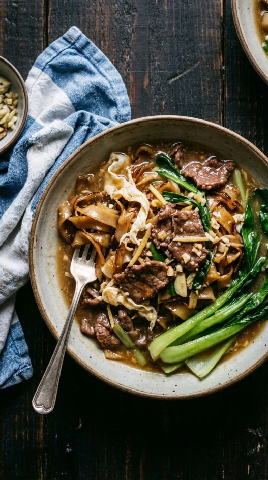 Fried Beef Hor Fun is a Cantonese-style noodle dish popular in Malaysia and Singapore. It pairs wide rice noodles with marinated beef slices and leafy greens, served under a glossy beef gravy thickened with egg white and starch. The dish gets its depth from wok heat — the slightly charred noodles and smoky aroma (known as wok hei) are part of its appeal. Though it looks elaborate, it’s essentially three quick preparations brought together in sequence: marinated beef, blanched greens, and a rich sauce poured over pan-fried noodles.
