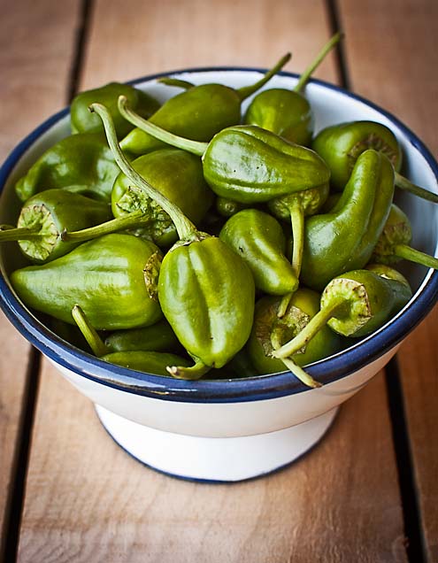 These little morsels of vegetable goodness originate in the northwestern region of Galicia, around the town of Padrón, hence their name. I have some kinfolk living in Galicia, at Santiago de Compostela, so I visit often and have the chance to eat fried Padron peppers at the local bars… delish. Padron peppers are usually eaten fried in olive oil and with a sprinkle of coarse salt that not only enhances their flavor, but adds a nice crunch. No need for any other garnish, simplicity and quality food at its best.