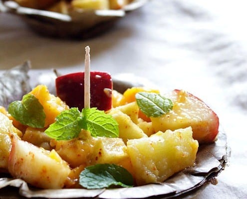 Fruit Chaat – Mildly spiced, savory assortment of fruits with fried potatoes & boiled sweet potatoes.