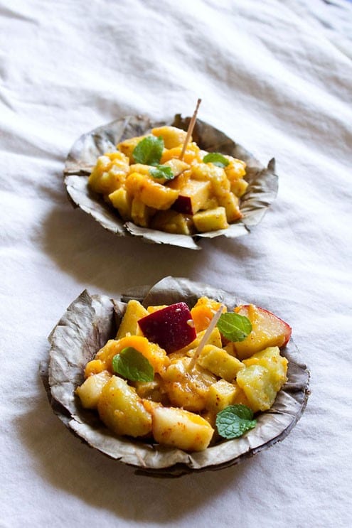 Fruit Chaat is a popular street food of North India and Pakistan. Here the fruits are tossed with some spice powders and the result is a bowl of fresh fruits with a hint of spice and tang. They are quite different from your regular fruit salad. Also, along with fruits, tubers like sweet potatoes and regular potatoes are also added to the fruit chaat.