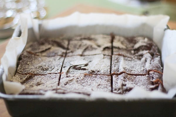 - Allow brownies to cool a few minutes then pull the edges of the parchment paper to remove the whole brownie block and set it on a cutting board. Use a sharp knife to cut brownies and garnish with powdered sugar if desired.