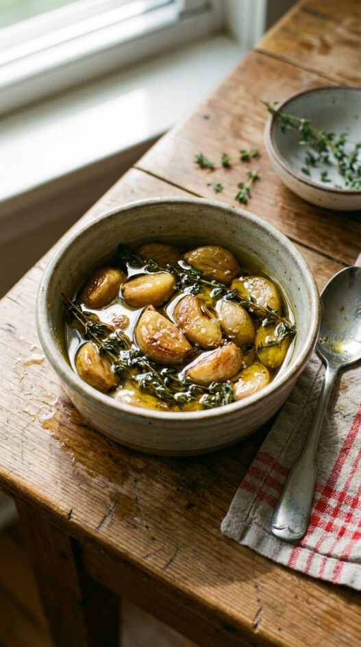 - Pour olive oil over the garlic until the cloves are nearly submerged. Tuck in the fresh thyme sprigs and sprinkle with salt.