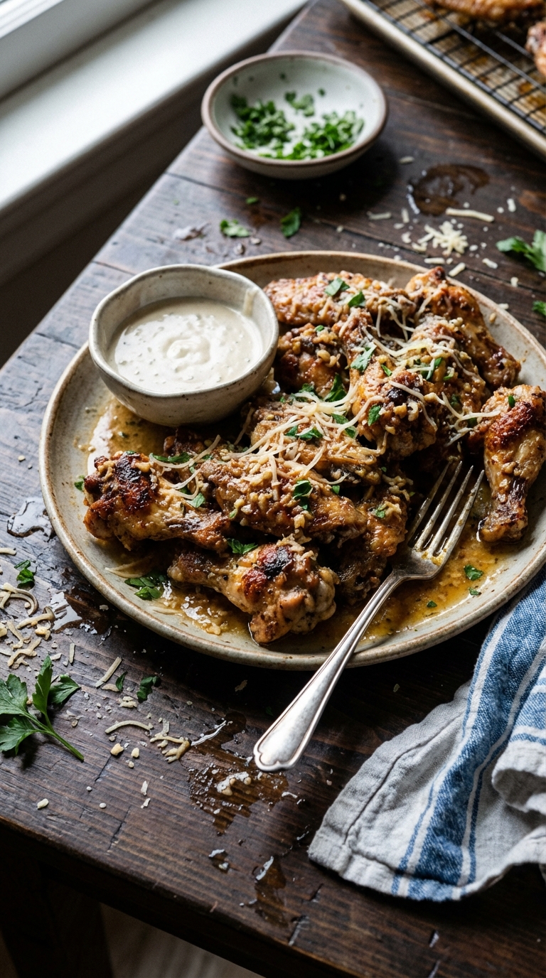 Crispy chicken wings tossed in a rich, garlicky Parmesan sauce. Decadent and perfect for parties!