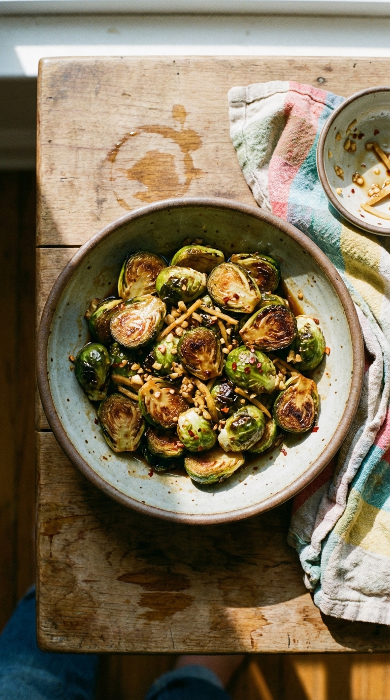Crispy Brussels sprouts get a flavor boost from garlic and ginger. A simple side dish with big flavor.