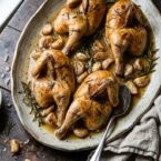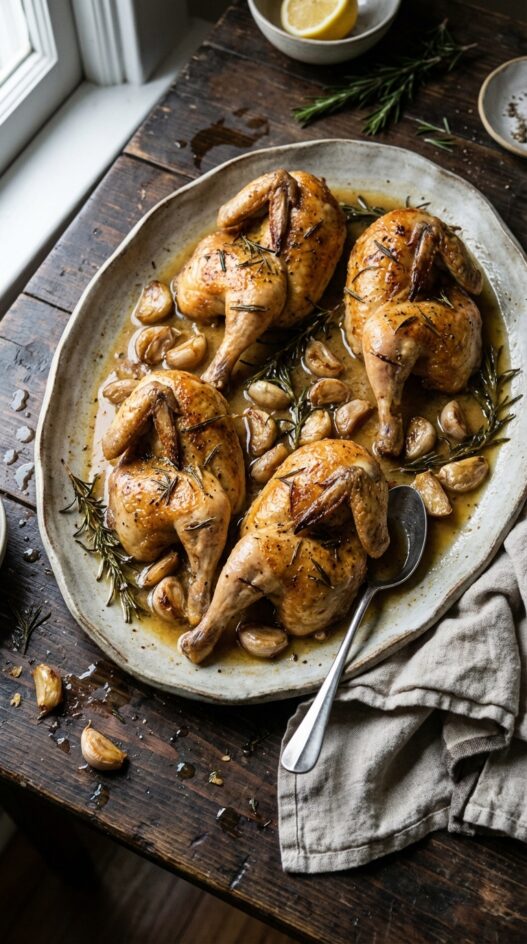 Roasted poussin with herbs and garlic, finished with a rich pan sauce. Perfect for a special occasion or a cozy night in.