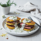 - To create the stacks, begin with a potato pancake. Top with 1 tablespoon (15ml) of red wine blue cheese sauce. Add a couple slices of steak and repeat these layers once more, finishing with a potato pancake on top. Garnish with rosemary and blue cheese crumbles.