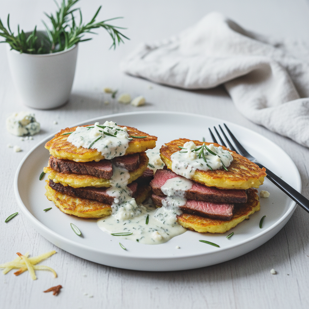 - To create the stacks, begin with a potato pancake. Top with 1 Tbsp of red wine blue cheese sauce. Add a couple slices of steak and repeat these layers once more, finishing with a potato pancake on top. Garnish with rosemary and blue cheese crumbles.