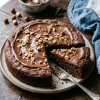 - Gently warm the chocolate hazelnut spread until easily spreadable. Spread on the cake and sprinkle with the remaining chopped hazelnuts.