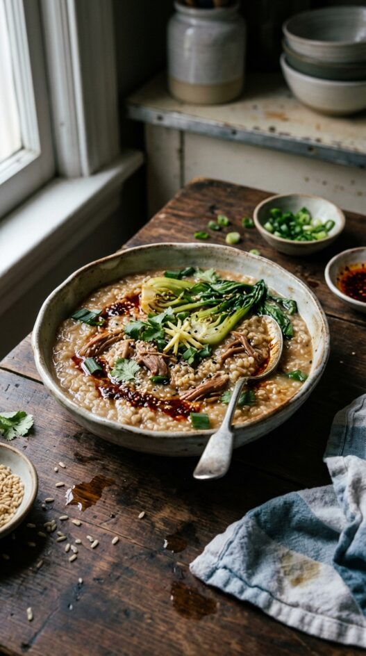 - Ladle the congee into bowls. Top with shredded chicken and a selection of garnishes like sautéed bok choy, sesame seeds, scallions, shredded ginger, chili oil, and cilantro.