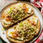 - Layer Brie over each slice of toast. Top with apricot preserves. Next, layer the cooked apple and leek. Garnish with crushed walnuts.
