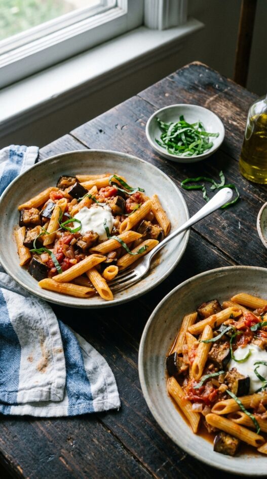Slice the Italian eggplants, season with salt, and roast them in the oven until tender; you can store them in the fridge and add them to the pasta when ready to serve.