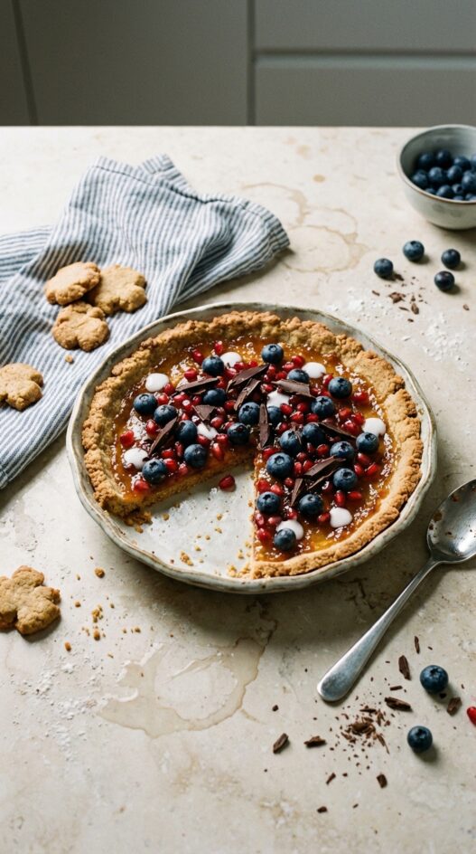 - Wash the blueberries and separate the pomegranate seeds under running water. Once the pie has cooled slightly, decorate with the fruit.