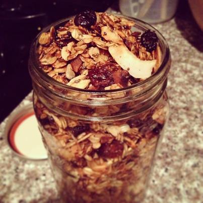 - Shape granola into a “donut” on large greased baking pan. Bake for 20-30 minutes on 350 degrees, stirring occasionally to ensure even cooking. (The “donut” ensures that you don’t end up with an uncooked middle.)
