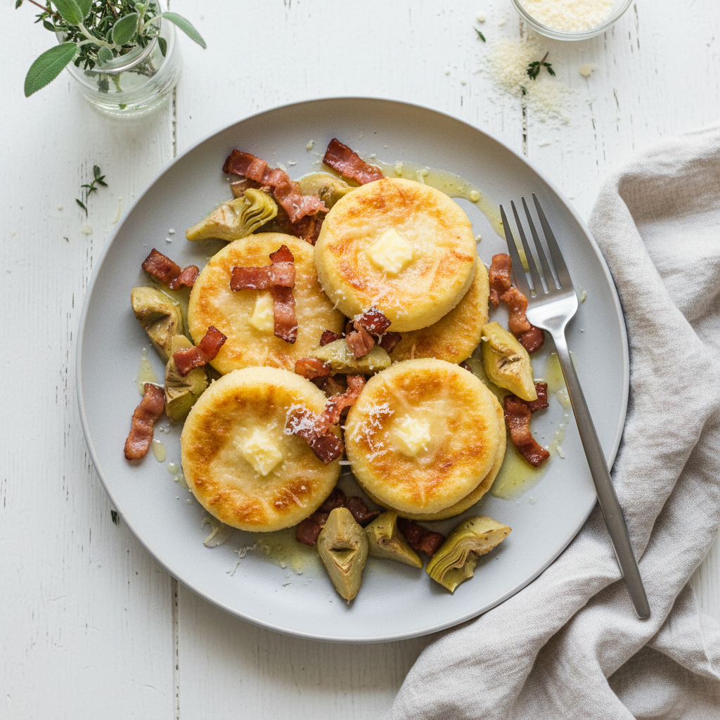 Crispy-edged semolina gnocchi, baked to perfection, then topped with a savory bacon and artichoke ragu. Pure comfort food!