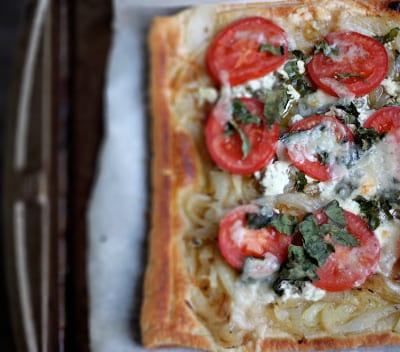 This tomato and goat cheese tart combines the flakiness of puff pastry with the richness of goat cheese and the sweetness of caramelized onions, topped with fresh tomatoes.