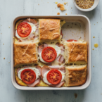 The recipe itself had already been adapted from an Italian Layer Bake so this sandwich is extremely versatile. You can make it how you like. On our first attempt, we found the sandwich was too moist and left it soggy, so we omitted some of the tomatoes and dried the ones out that we used with a little salt and drained them on paper towels. You can omit them completely if you like. The eggs form a custard inside the sandwich and the top is crispy and golden browned to form this gorgeously gooey sandwich.
