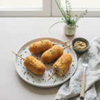 Elevated corn dogs with a surprising twist: tender chicken confit sausage. A sophisticated take on a classic.