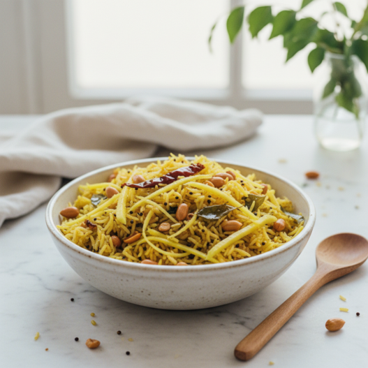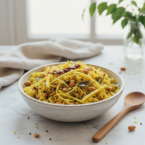 - Add turmeric and mix well. Add cooked rice and heat through. Sprinkle asafoetida.