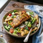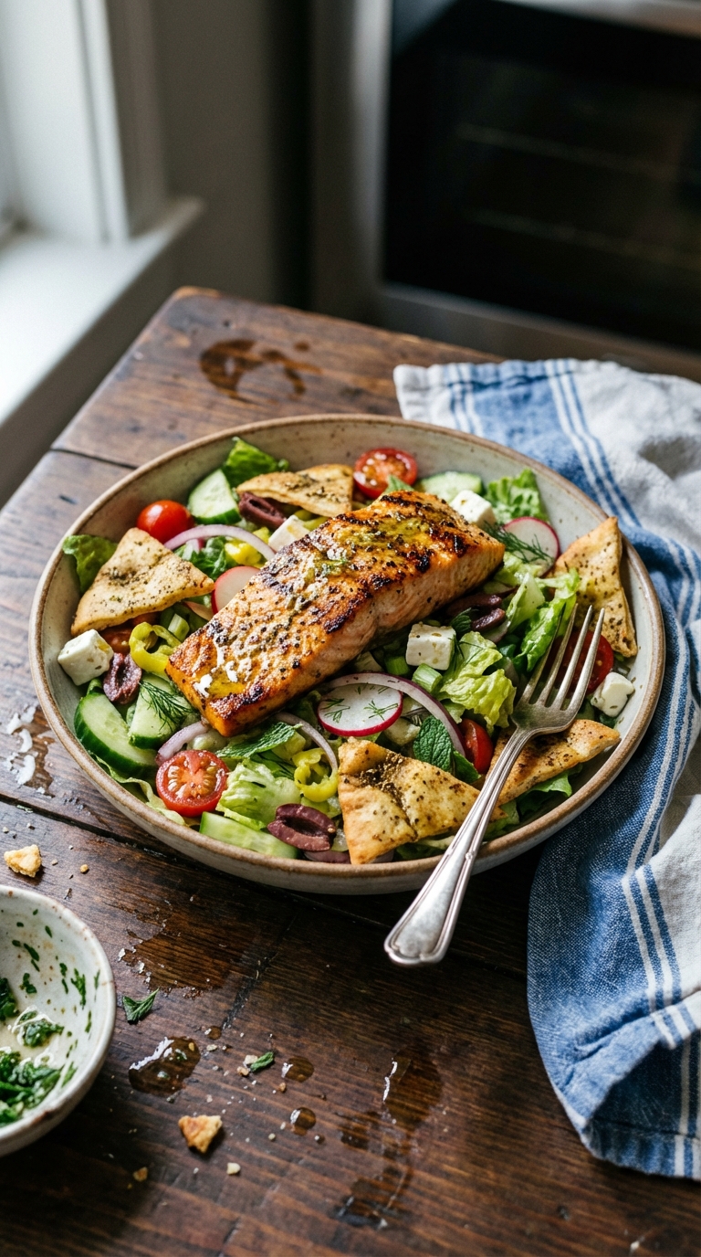 This fattoush salad comes with a Greek spin, a red wine vinaigrette and grilled salmon to make it a complete meal.