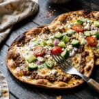Much thinner than the usual pizza, this Greek Lamb Flatbread is topped with a little feta, a garlic-mint sauce and a fresh vegetables for great crunch. A perfect meal or appetizer.