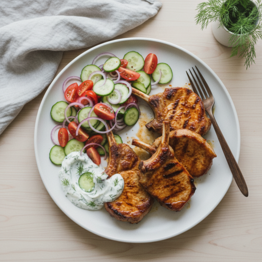 Juicy pork chops are the star, complemented by a bright tomato and cucumber salad. Marinate the pork for extra flavor!